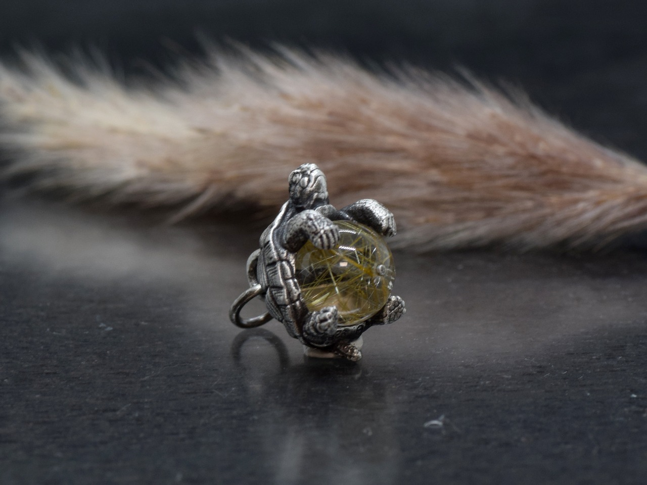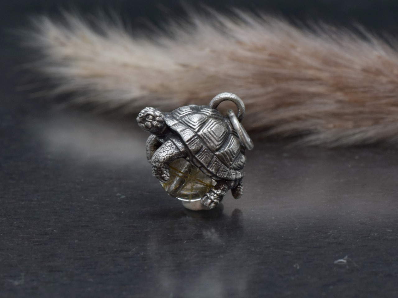 ■商品名 限定1点 身守りリクガメ玉ペンダント ゴールドルチルクォーツ 革ヒモネックレス付き