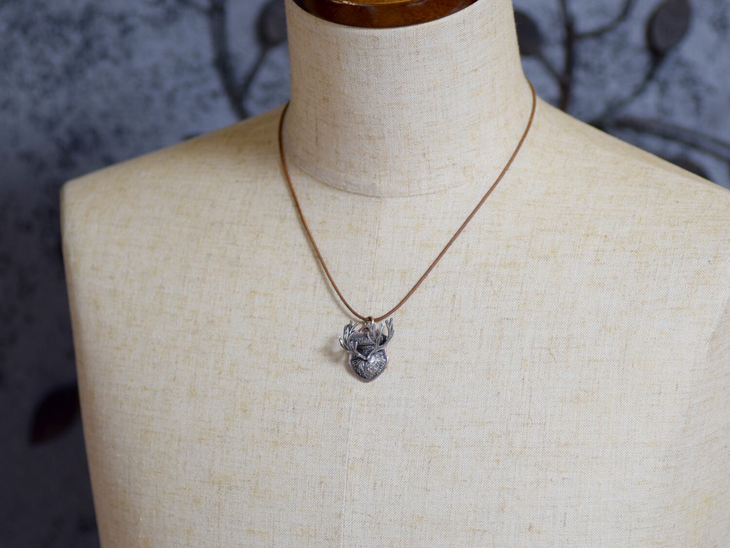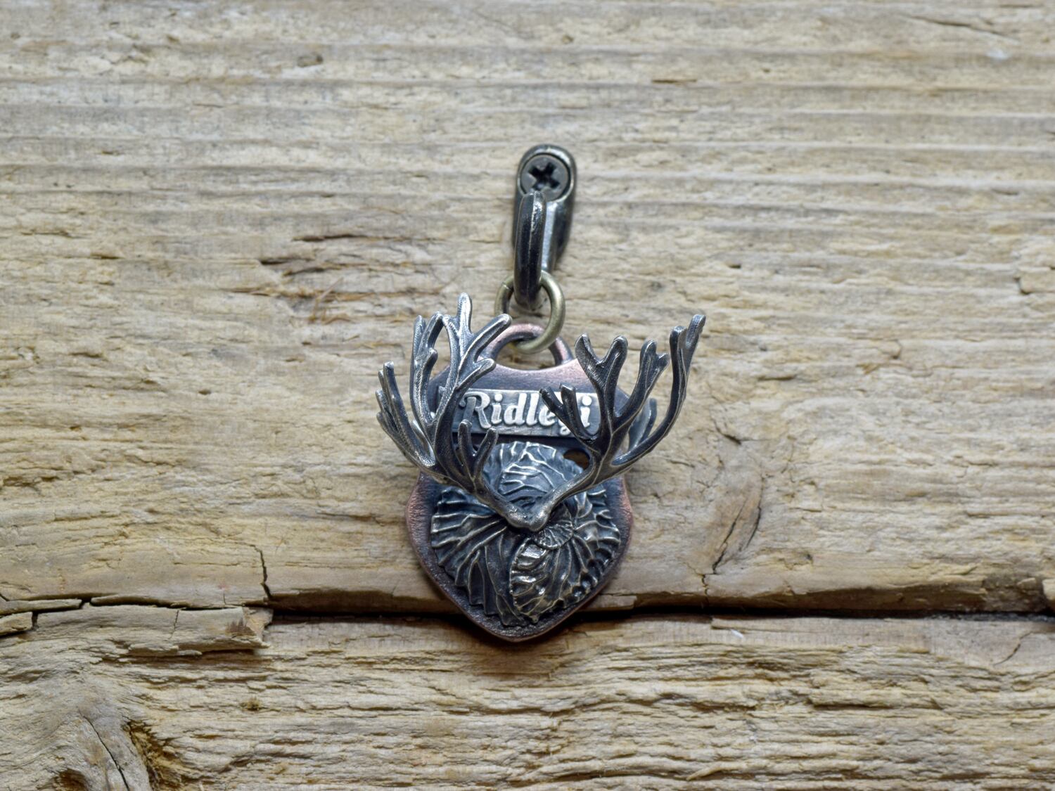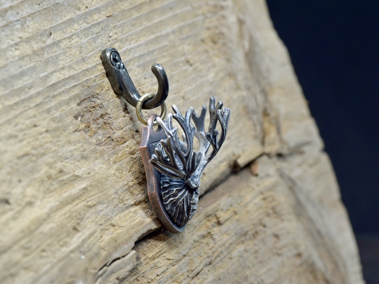 ビガクシダ部分、ネームプレートはシルバー925、板部分は銅、ネックレスを通す丸カンは真鍮の3種類を素材でできています。