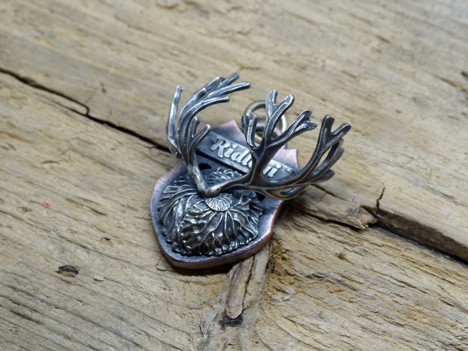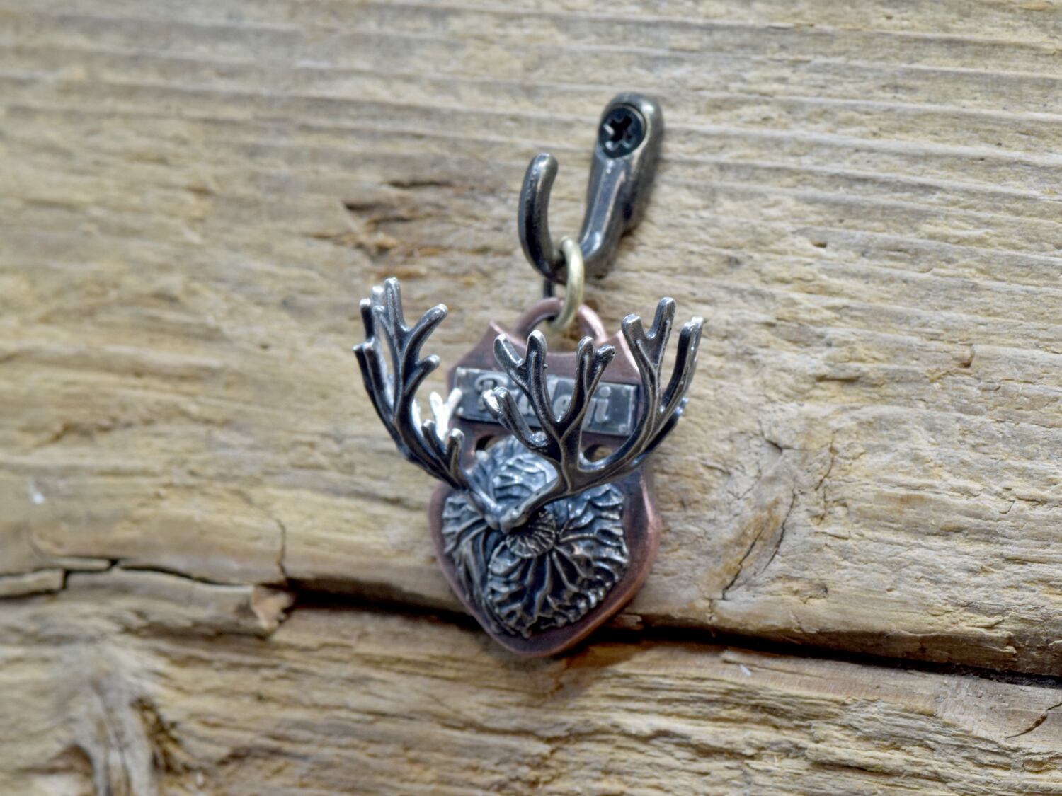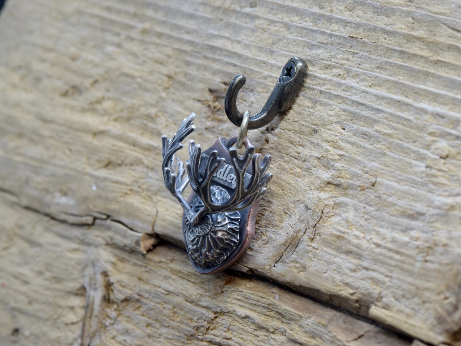 ビガクシダ部分、ネームプレートはシルバー925、板部分は銅、ネックレスを通す丸カンは真鍮の3種類を素材でできています。