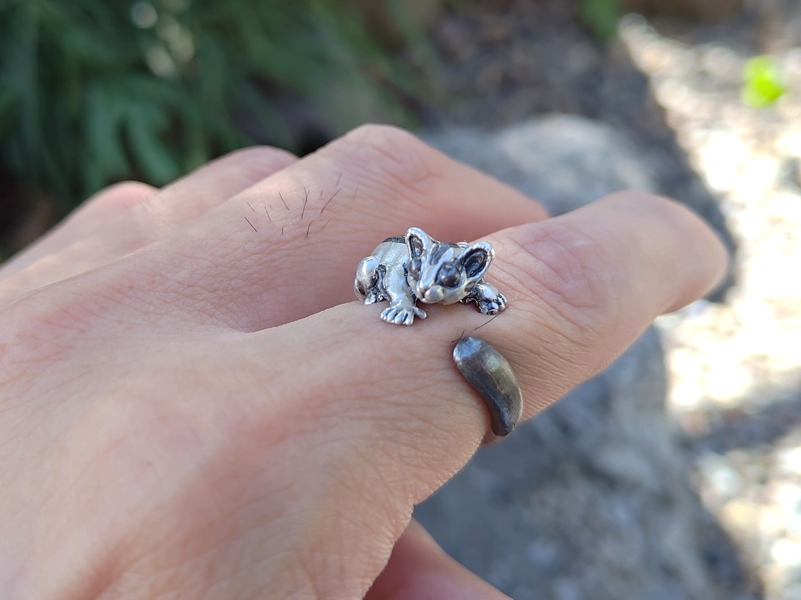 指に抱きつくフクロモモンガの指輪。