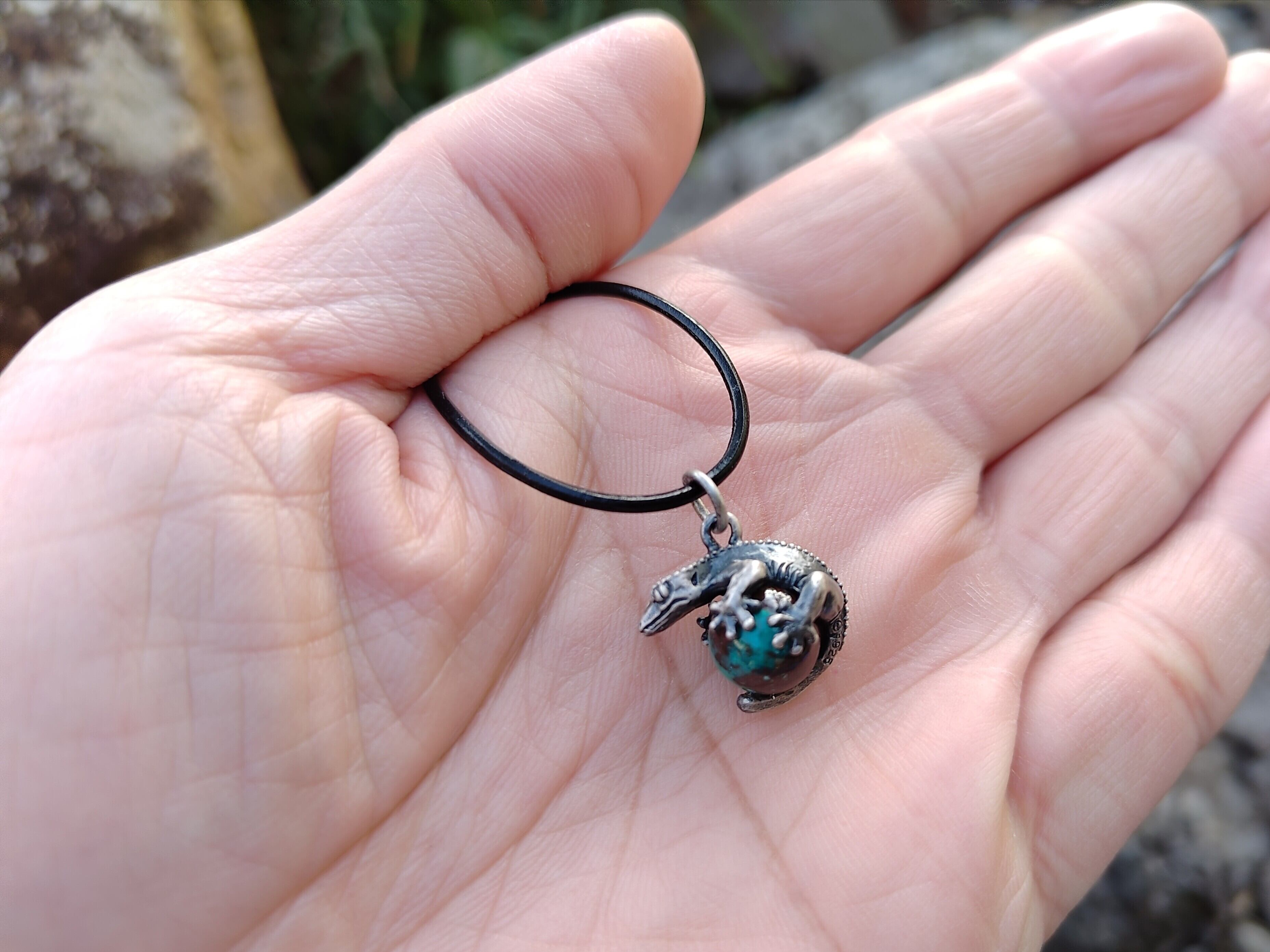 ■商品名 限定1点 クレステッドゲッコー(オウカンミカドヤモリ)玉ペンダント クリソコラ 革ひもネックレス付き