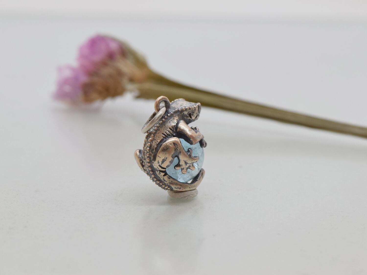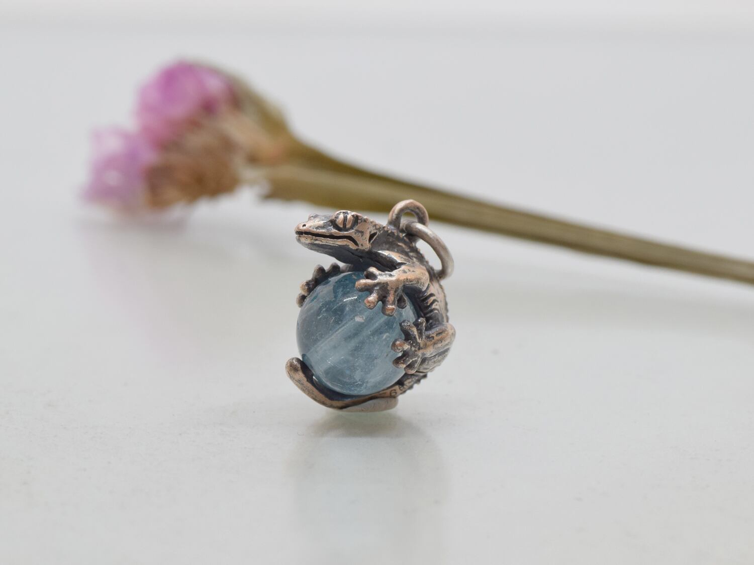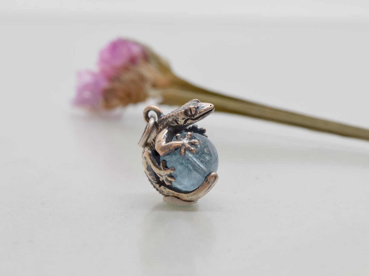 ■商品名 限定1点 ピンクシルバー製 クレステッドゲッコー玉ペンダント ブルートパーズ 革ひもネックレス付き